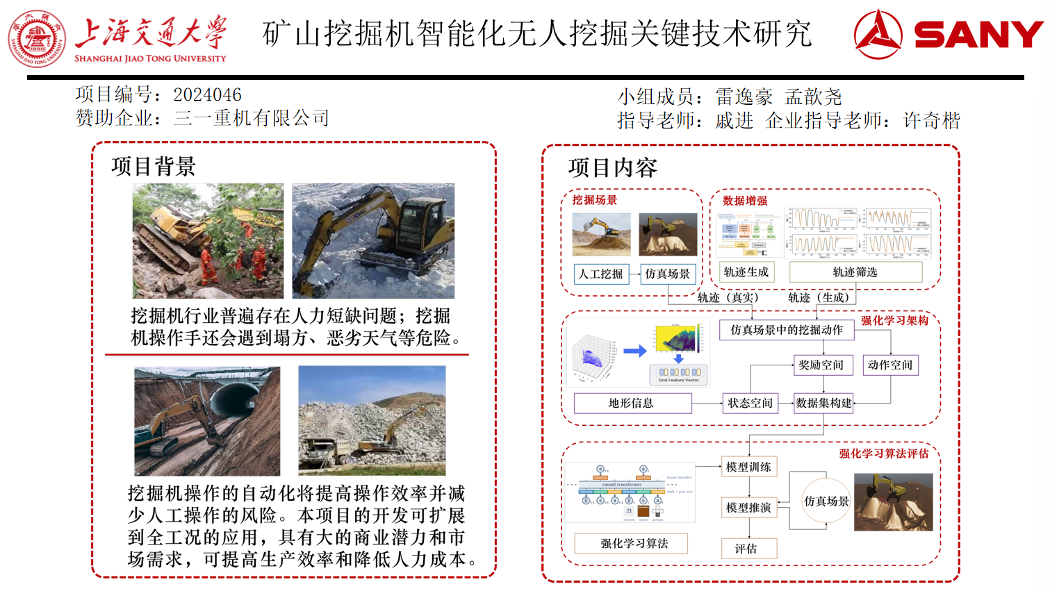 随着自动化和人工智能技术的飞速发展,建筑机械行业正经历着重大变革。挖掘机作为建筑操作的关键设备,其自动化潜力巨大。然而,挖掘作业环境的多变和不可预测性,以及对精确处理的需求,使得自动化任务异常复杂。本项目题为矿山挖掘机智能化无人挖掘关键技术研究,旨在解决挖掘自动化中的复杂挑战。通过使用从真实场景收集的经验数据和基于Unity的仿真环境,训练和评估强化学习模型。项目整体架构包括数据收集、数据增强、数据制作及模型训练推演四部分。